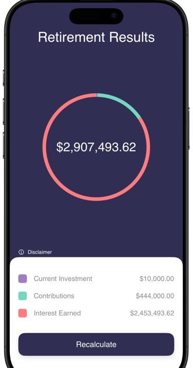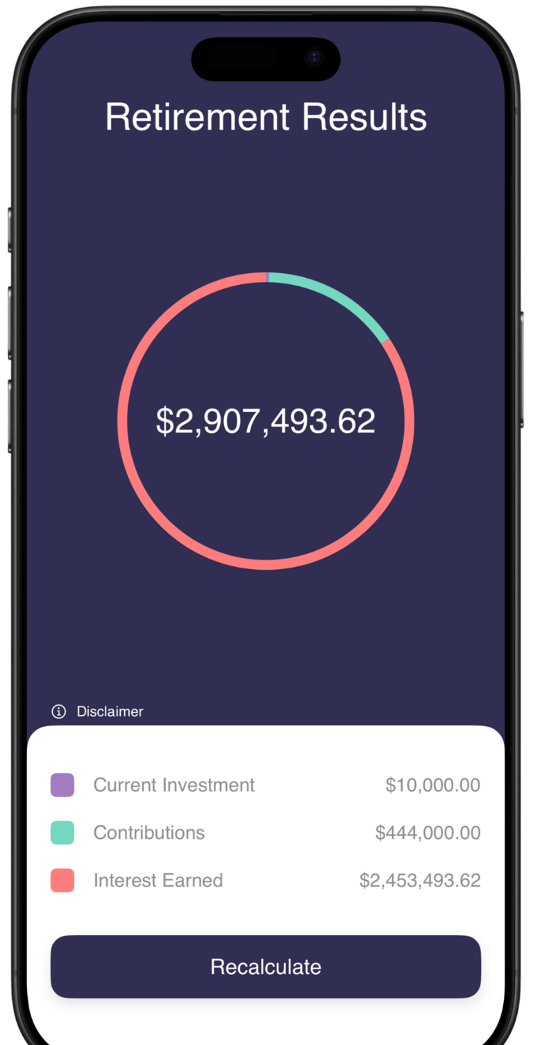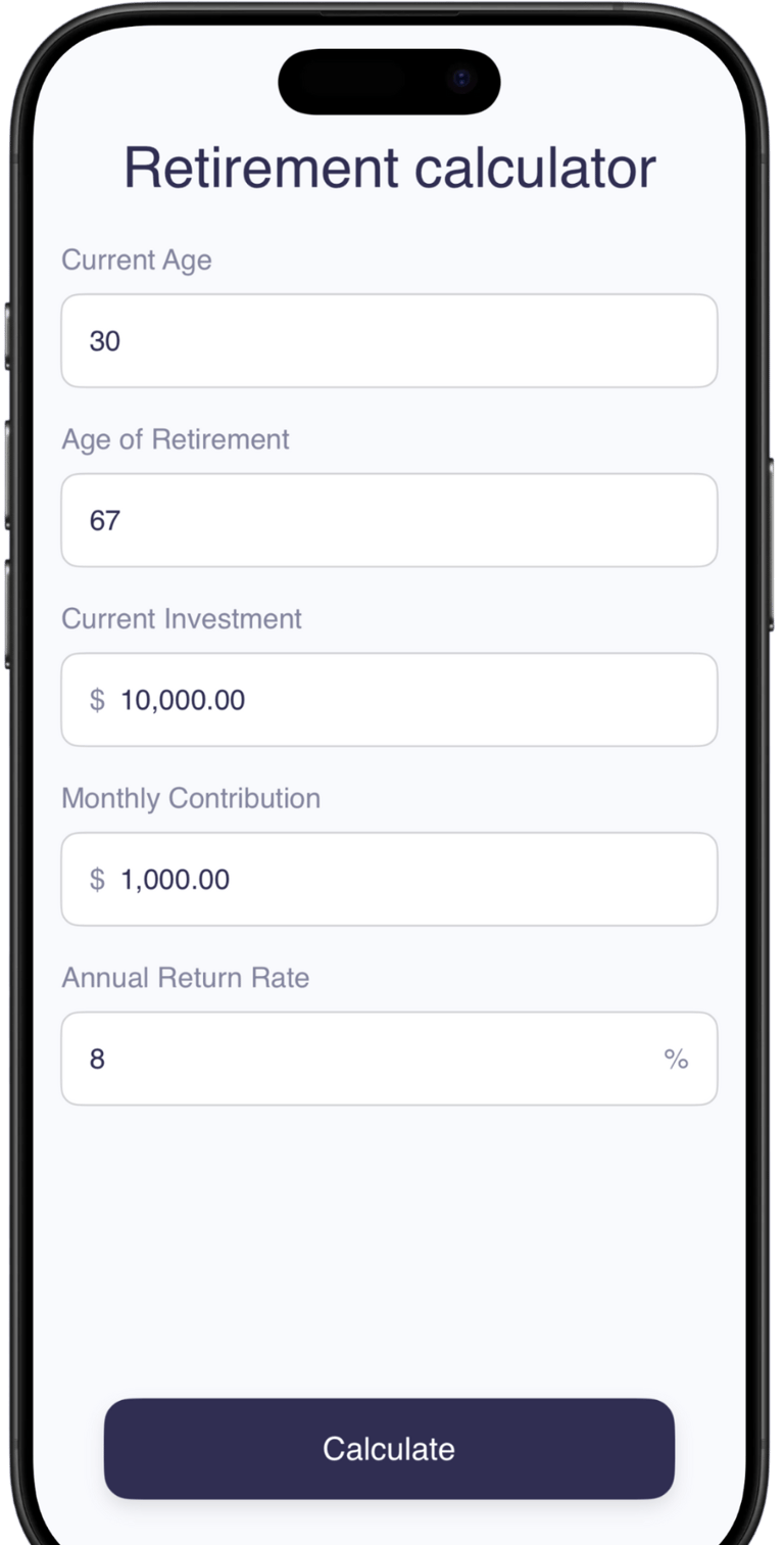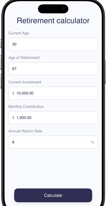 Plan your golden years with confidence using our Retirement Calculator app. Effortlessly compute your retirement savings, monitor your contributions, and project your interest earned over time. Whether you’re preparing for retirement or fine-tuning your financial strategy, this app empowers you to build your nest egg and make smart, informed choices for a secure future.